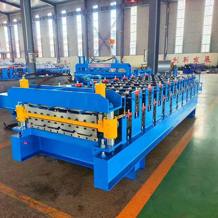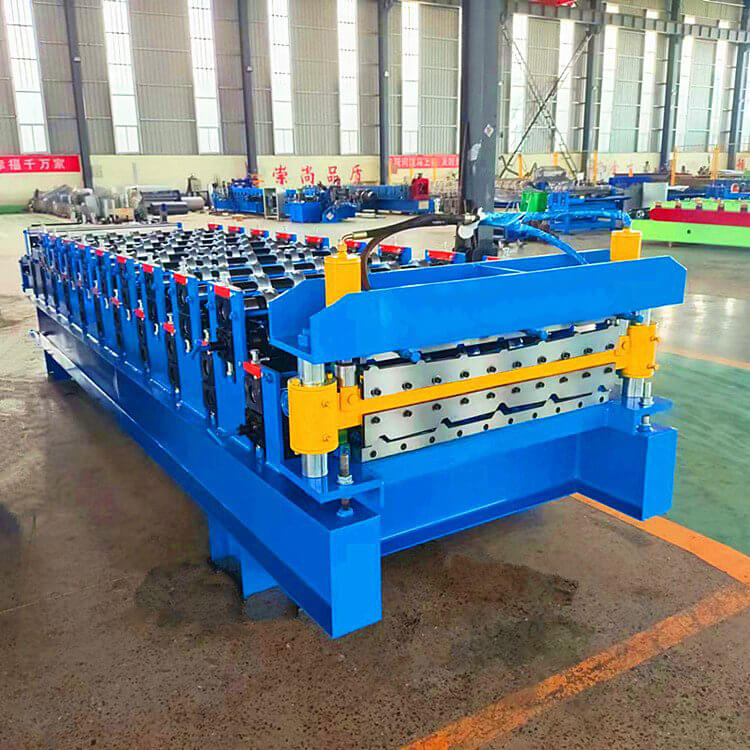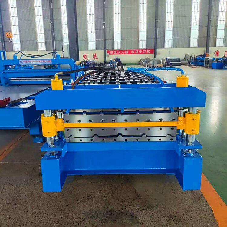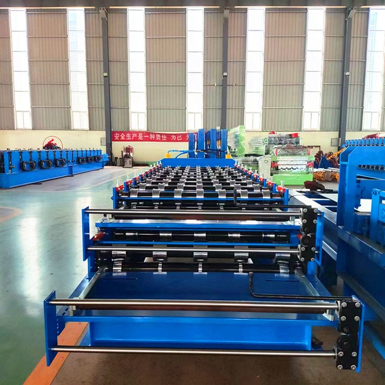 860---910双层压瓦机的生产是在高或低机架之间变换,生产一种轮廓的彩钢板安装在低机架上,生产另一种板型的轧辊安装在高机架上面,生产线有一个开卷机,一个共用切断剪切机,如果彩板喂入低层轧辊,成型一个板型;如料卷喂入高层的轧辊,而成型另一个断面。此压瓦机设备的出现,节省了设备的占地空间,特别适合场地小的彩钢瓦生产商及安装现场生产压制彩钢瓦。替换两种不同断面板材的生产,也提高了产出率。双层彩钢压瓦机控制系统的特点;该控制系统操作简单,是一次成型,生产流程为:开卷--前进成型--压型--切割。双层彩钢压瓦机本系统控制精度不错,每片剪切精度小于1mm,满足工艺要求。程序运行稳定。双层彩钢压瓦机执行部分有变频器驱动电机,液压站电机,切刀的两个液压电磁阀。双层彩钢压瓦机检测部分有:检测彩色钢瓦长度的脉冲编码器,压型的上下行程开关,切刀的上下行程开关,压型的上下操作按钮,切刀的上下行程按钮,急停开关,液压启停开关等等。